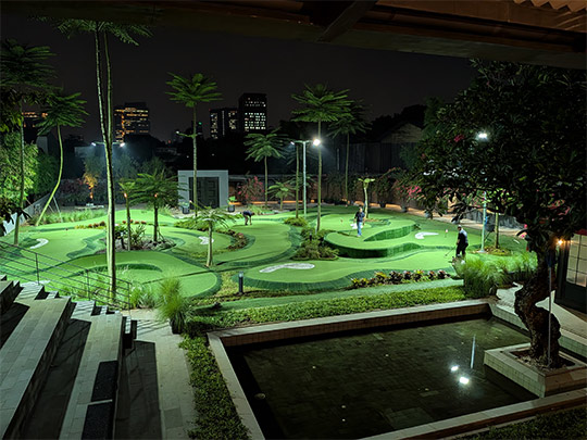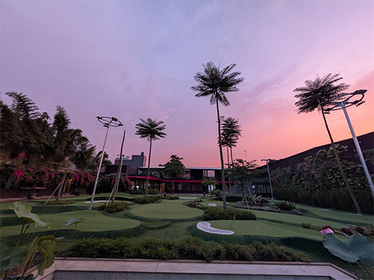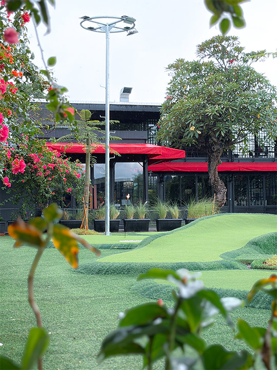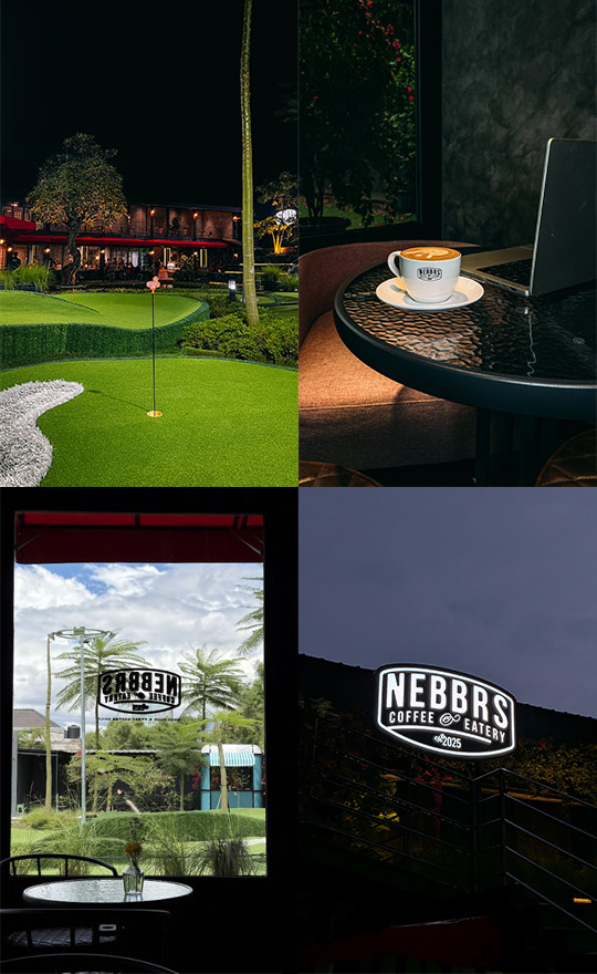 Elemen paling mencuri perhatian hadir di halaman depan: mini golf. Sebuah sentuhan playful yang tidak terasa dibuat-buat, melainkan menyatu dengan konsep ruang terbuka Nebbrs. Anak-anak, keluarga muda, hingga teman-teman yang datang sepulang kerja bisa berbagi momen yang sama—bermain ringan, lalu duduk bersama menikmati hidangan. Sebuah pengingat bahwa pengalaman kuliner tidak selalu harus serius.
