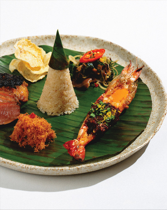 Highlights include Bebek Hitam from Java, slow-roasted over open fire with caramelised bumbu Madura; Udang Sambal Asap from Sulawesi, featuring steamed tiger prawns with smoked mackerel and roa sauce; and Serundeng Udang Papai from Kalimantan, a fragrant blend of toasted coconut, chilli, and dried shrimp. From Nusa Tenggara comes the vibrant Rumpu Rampe, while Bali contributes Roroban, an ancient soup of young papaya and coconut water cooked inside a young coconut. The experience is anchored by Nasi Minyak Tumpeng from Sumatra, fragrant jasmine rice served in a ceremonial cone. Dessert concludes with tableside Es Campur, followed by tea or coffee.