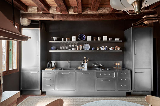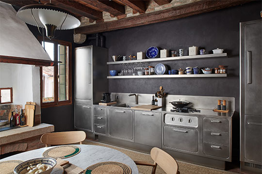 Chosen by a French gallery owner to express her personal vision of home, the Ego kitchen sits among restored wooden beams, terracotta floors, stone shelving, a grand fireplace, and delicate blown glass, dialoguing seamlessly with a setting that preserves the evocative allure of historic Venice. Passionate about traditional Italian cuisine, the owner designed the space to blend professional performance with daily life, where cooking feels effortless and enjoyable. Hand-polished stainless steel, softened through craft-based treatments, adds warmth and texture, making the kitchen not just functional but inviting.