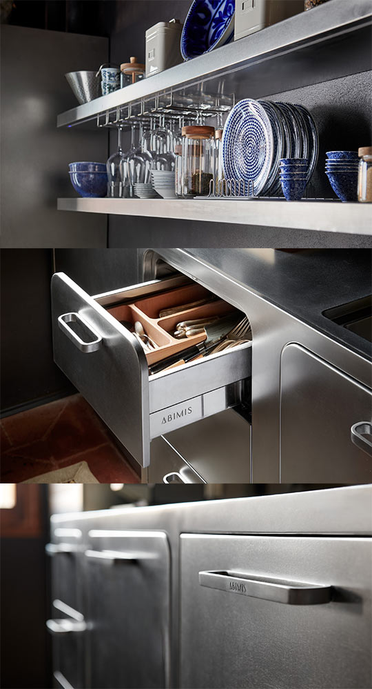 In the quiet heart of Venice, away from the usual tourist routes, a project has emerged where memory, precision, and modern vision converge. Perched atop an 18th‑century building in the Castello sestiere, overlooking the city’s rooftops and the dome of the Basilica dei Santi Giovanni e Paolo, this Abimis kitchen exemplifies materiality, functionality, and customization. Crafted entirely from AISI 304 stainless steel and orbitally polished by hand, the bespoke Ego composition asserts a sharp, recognisable presence while engaging the space with an understated charm.
