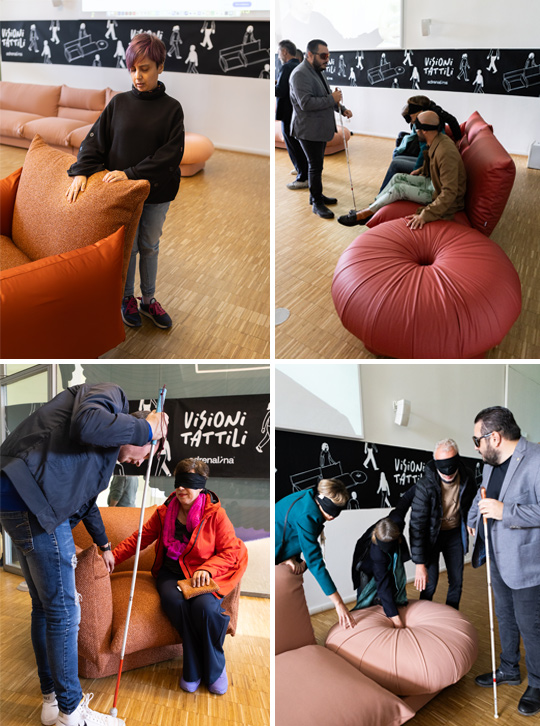 Raised Braille inscriptions along the sofa connect to its origins and enrich communication. Essential feedback came from Museo Omero, Italy’s first tactile museum, and the Istituto Cavazza, ensuring the design truly meets users’ needs.