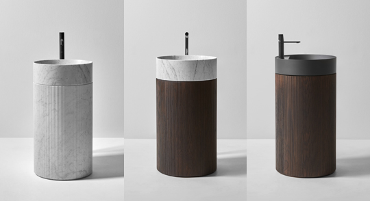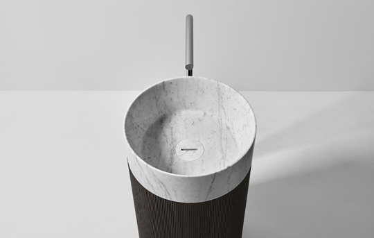 Its identity is revealed through its surface. Fine vertical grooves run along the column, turning a technical process into decoration. The resulting play of light and shadow gives the washbasin a subtle three-dimensional texture that feels dynamic yet restrained.