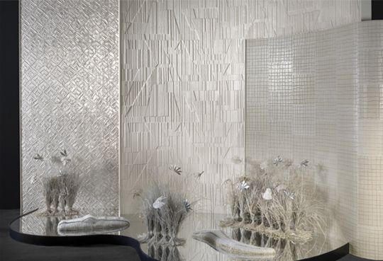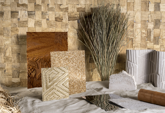 Natural materials—raffia, cork, woven grasses, and shells—are reinterpreted through unexpected applications, revealing the versatility of wallcoverings as a tactile and narrative medium.
