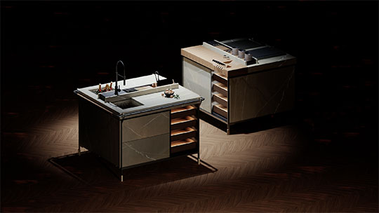 Wooden modules complete the system, adding warmth and structural solidity while offering a tailored level of customization. The result is a modular and multifunctional kitchen that balances technical performance with a strong visual identity—designed not only for use, but for living.