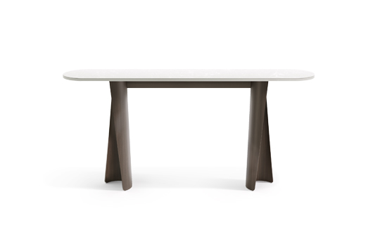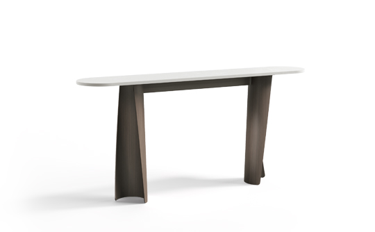 Defined by its sculptural presence, Ulisse is anchored by two solid sheet metal supports, curved into a spiral configuration. This gesture introduces a sense of structural lightness, where the interplay of light and shadow becomes integral to the design. The composition is intersected by an architrave element, which not only supports the marble top but also reinforces a precise equilibrium between dynamic tension and architectural clarity.