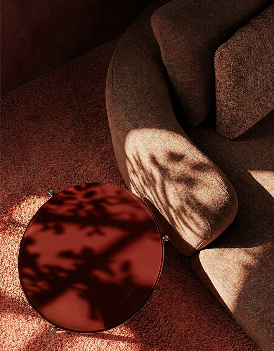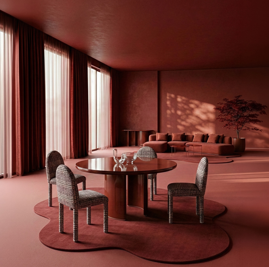 Across the collection, pieces unfold as part of a cohesive narrative. The Tobie Round Dining Table brings deep red into sculptural focus, its mirrored surface amplifying reflection and spatial depth, while the Archie Dining Chair introduces a subtle graphic rhythm through textile. The Tobie Console extends this tonal dialogue with quiet presence, balanced by the lightness of the Demli Small Glass Cocktail Table.