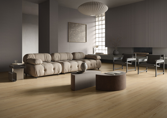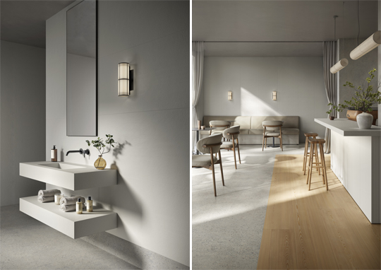 Completing the presentation is Texture, a study in restraint and subtlety. With its soft, clouded appearance and refined tonal gradations, the collection emphasizes surface tactility through a “soft-touch” finish. Designed for holistic applications—from floors and walls to integrated architectural elements—Texture also incorporates variations such as Canvas and Canneté, expanding its expressive potential across different interior styles.