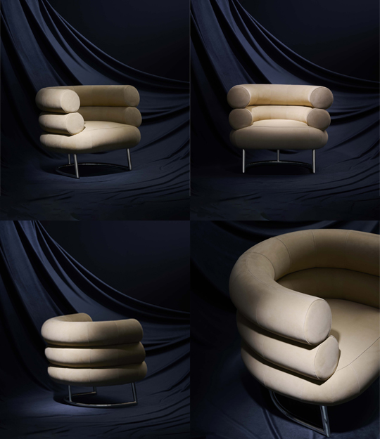 Its signature silhouette is defined by two oversized padded rolls that wrap the sitter in a semicircle, balanced on a delicate steel base. The form famously echoes Bibendum, the Michelin Man whose stacked tyre-like figure inspired Gray’s playful yet sculptural interpretation.