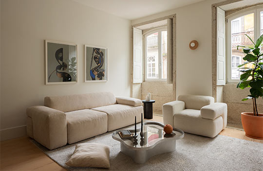 Developed as a system of eleven distinct modules, the Soft Stone Sofa is composed of asymmetrically arranged cubic elements softened by rounded edges. Its design draws from two distinct yet complementary references: the staggered stone terraces of Parque da Cidade in Porto, and the sculptural language of Isamu Noguchi, where solidity and softness quietly coexist.