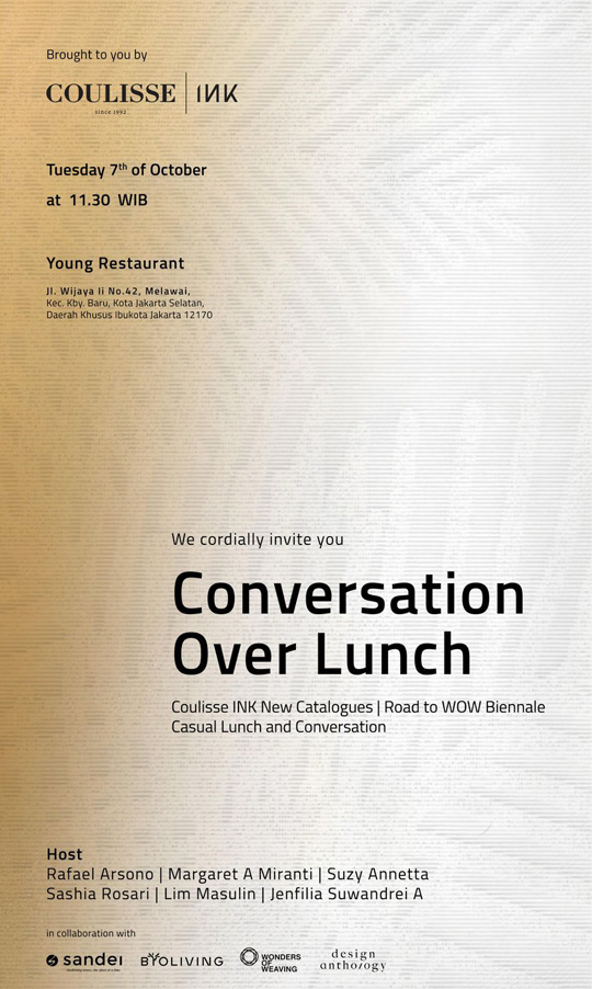 The afternoon opened with Jenfilia S. Arifin, Director of Coulisse INK, sharing a glimpse of the brand’s new collection and its upcoming participation at the WOW Biennale. Jenfilia also introduced the event’s hosts — Rafael Arsono, Margaret A. Miranti, Suzy Annetta, Sashia Rosari (Founder of Young Restaurant) , and Lim Masulin (Founder of BYO Living) — while highlighting that Young Restaurant, the venue itself, was designed by the architect couple Rafael Arsono and Margaret A. Miranti.