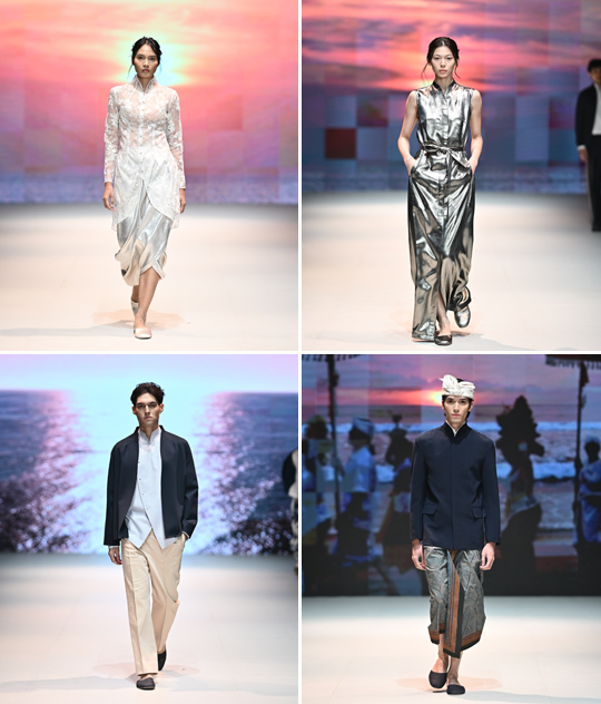 Dari nuansa megah itu, panggung kemudian bergeser ke interpretasi tropis yang lebih halus lewat Archipelago Cruise dari KRATON Auguste Soesastro. Koleksi ini memadukan silk suits dan linen parkas dengan sarung Bali tenun tangan, menciptakan dialog antara tradisi dan modernitas yang diterjemahkan lewat sensibilitas tailoring global. Lima belas tahun setelah membawa Bali ke panggung New York, Auguste kembali membuka lembaran lama—kali ini bukan dalam balutan eksotika, melainkan refleksi yang merekam dua gaya hidup kontras di pulau dewata: akar tradisi yang kuat dan arus modernitas yang kian deras.
