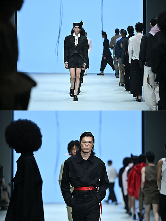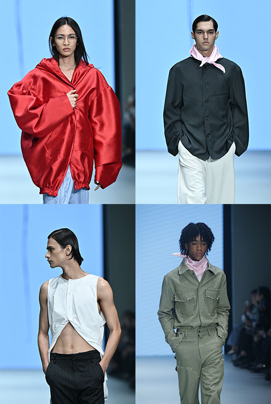 Menutup malam, Sean Sheila menampilkan koleksi “Mens Distort”, sebuah eksplorasi baru dalam lini menswear mereka. Melalui seragam klasik—dari T-shirt sederhana hingga jaket militer—Sean Sheila menelusuri banyak kehidupan yang bisa dimiliki sebuah pakaian. Setiap potongan dimulai dari bentuk yang familiar, lalu digeser sedikit dari pakem: denim jacket dengan mandarin collar, kaus putih dijahit dengan kawat halus, menciptakan ketegangan visual yang janggal tapi memikat. Koleksi ini bukan tentang membongkar tatanan, melainkan tentang distortion yang subtil—mengubah sekitar lima persen saja dari sesuatu yang kita kenal, agar terasa asing dan menuntut perhatian baru.