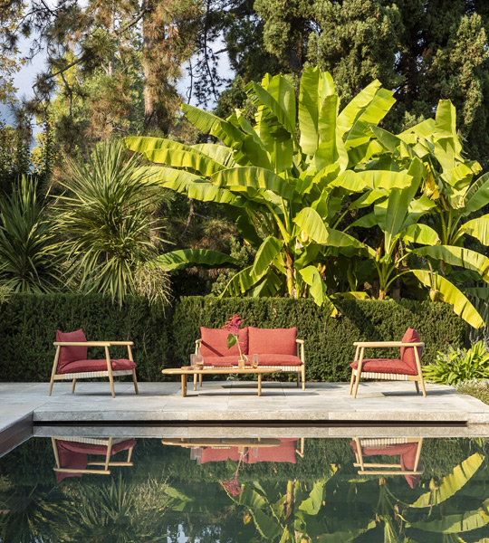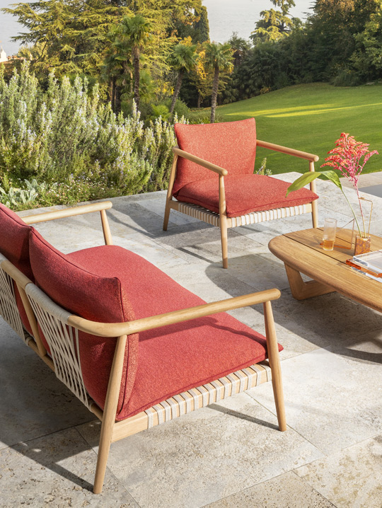 The collection unfolds as a versatile seating family—armchair, small armchair, and sofa—designed to furnish terraces, gardens, and outdoor lounges with the same compositional harmony typically reserved for interiors.
