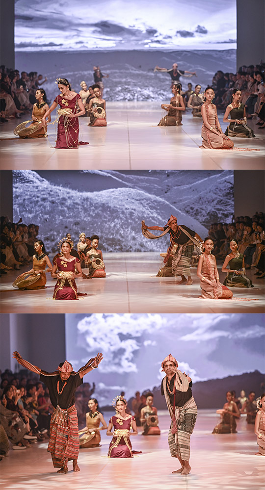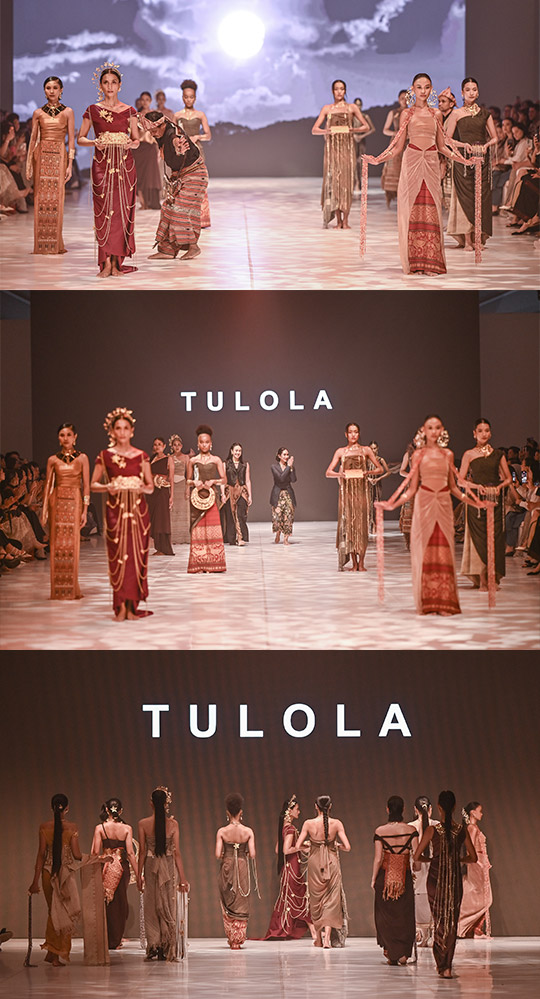 Panggung Jakarta Fashion Week (JFW) kemudian bertransformasi menjadi kanvas teatrikal yang sakral, dibuka dengan Koâloes—teriakan nyanyian sabana yang memanggil. Empat penari dan pendoa dari Indonesia Timur melangkah, mengiringi model dengan lantunan gitar kaesmeto yang magis. Dihiasi perhiasan TULOLA, dua belas model berjalan, tubuh mereka menjadi narator perjalanan spiritual yang elegan dan penuh makna.