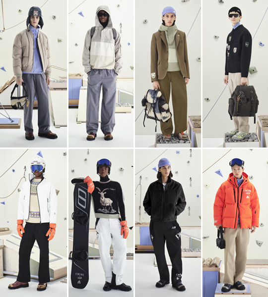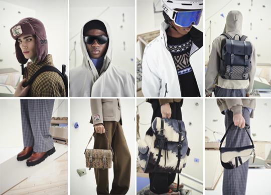 Blazers and turtlenecks meet cargo and ski pants, while technical canvas pieces with clean, minimalist lines define a wardrobe made for movement and sophistication. Accessories, including the iconic Saddle bag, feature Dior Mountain patches that evoke a spirit of exploration.