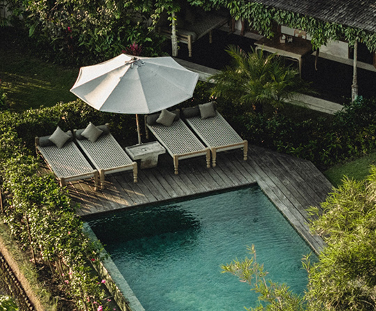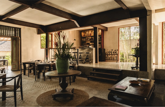 Accommodation continues this dialogue between heritage and ease. The bungalows combine restored joglo façades, handmade tiles, timber detailing, and stone surfaces with contemporary amenities. Some feature open-air Balinese bathrooms framed by foliage; others open onto private patios designed for quiet mornings. For a more secluded stay, a three-bedroom villa sits within its own garden, complete with a pool and a dedicated team, including a chef and butler.