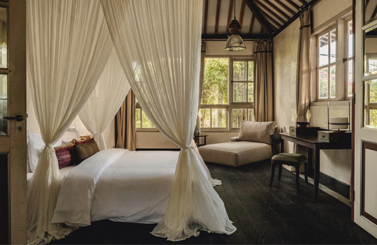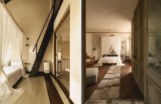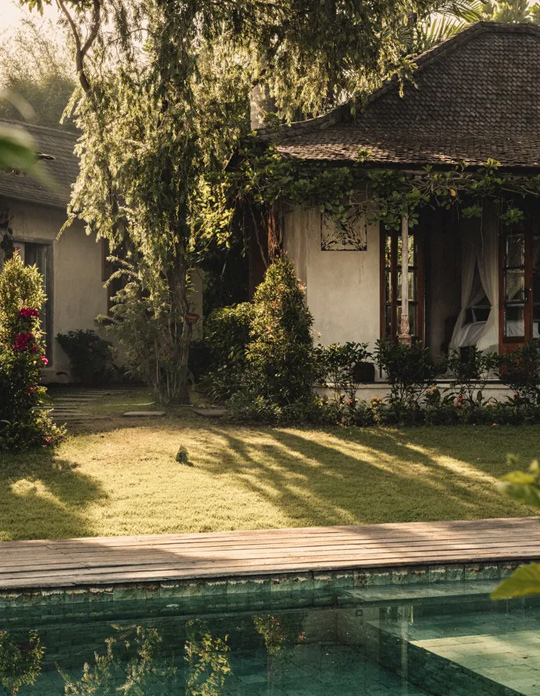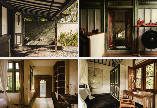 That philosophy continues indoors. Interiors are calm and unforced, defined by original wooden floors, generous ceiling heights, and soft white linens. Indonesian craftsmanship appears quietly throughout—from hand-carved wooden entrances and vintage furnishings to old agricultural tools once used in rice fields, now reimagined as sculptural objects. Materials are chosen to age gracefully: timber and stone dominate the palette, recycled fabrics are used for upholstery, and organic latex mattresses reflect a thoughtful approach to comfort and longevity.