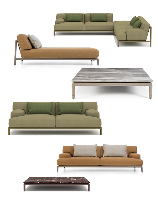 Lodge is a lounge collection inspired by the welcoming atmosphere of nature retreats. Defined by generous proportions and deep seating, it includes sofas—also modular—an armchair, daybed, pouf, and coffee tables with marble, lava stone, or aluminium tops.