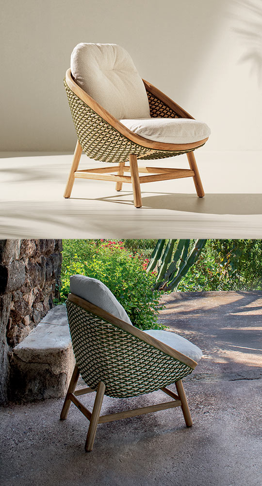 Teodora is an outdoor armchair that combines natural materials with enveloping comfort. Curved teak frames an oval silhouette, embracing a woven Olive Green rope seat with a refined geometric pattern. Soft bouclé cushions complete the design, offering a relaxed, tactile experience suited to both residential and contract spaces. Teodora expresses a timeless idea of outdoor beauty, rooted in craftsmanship and comfort rather than excess.
