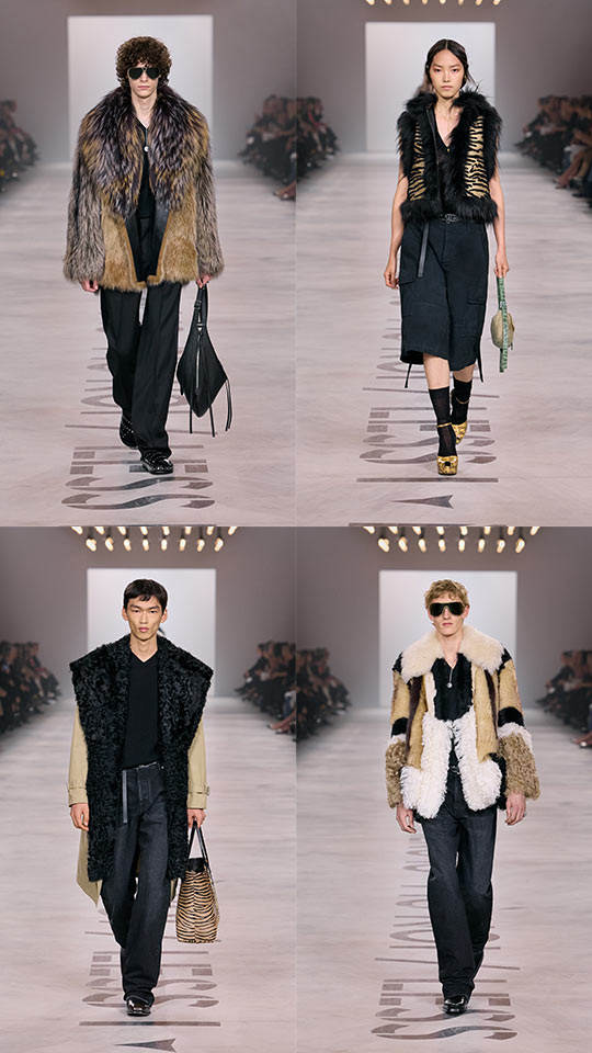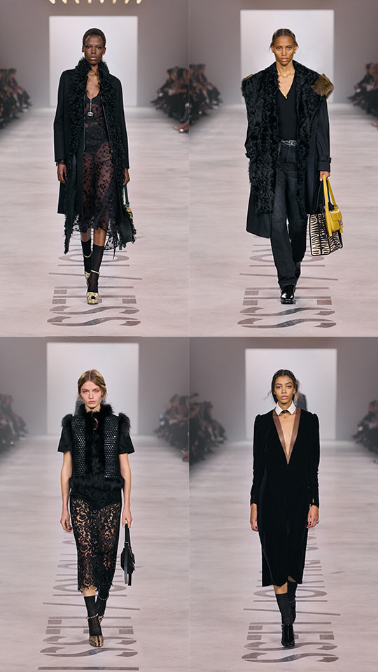 Tailoring, lace dresses, and supple leather pieces formed a wardrobe defined by clarity and practicality, while fur-trimmed coats subtly reaffirmed Fendi’s heritage as a master of leather and fur craftsmanship.