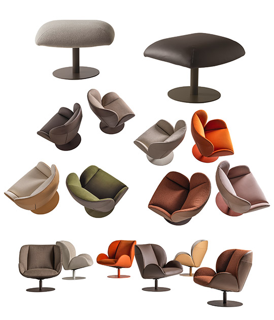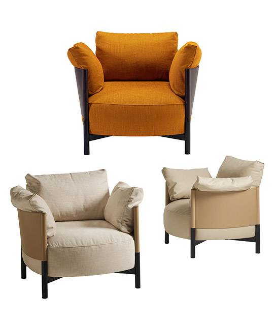 Werner Aisslinger’s Ocean revisits the enveloping silhouettes of the 1960s and ’70s. A rigid, sculpted shell offers structure and protection, while generous ergonomic cushions promise total relaxation. Ocean’s hybrid personality—part classic, part contemporary—allows it to inhabit both refined and eclectic spaces with ease. Available in leather, fabric, or an elegant bi-material combination, it stands as a modern icon of comfort.