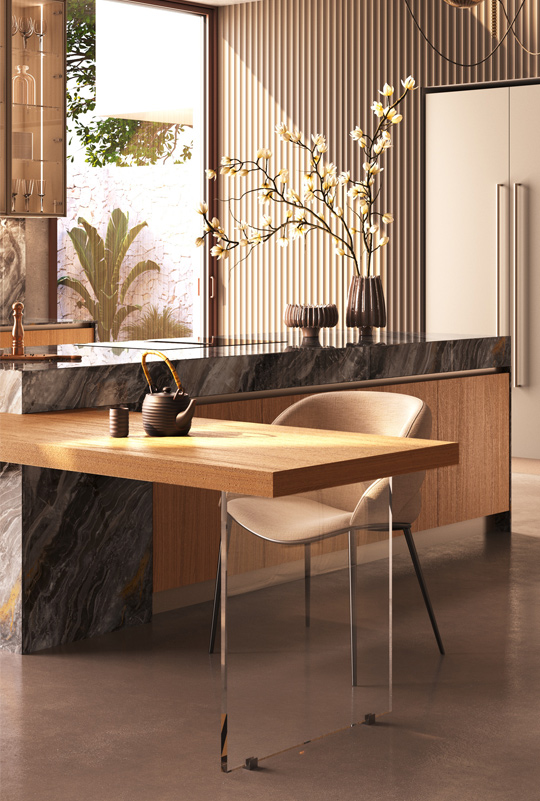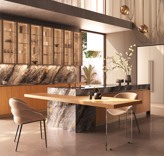 Conceived as an integrated system for open-plan interiors, the kitchen highlights the expressive qualities of natural materials. Oak shapes the base units and island, bringing warmth and solidity to the composition, while the bold veining of Taurus gres used for worktops and backsplashes introduces a mineral depth that contrasts elegantly with the organic texture of wood.