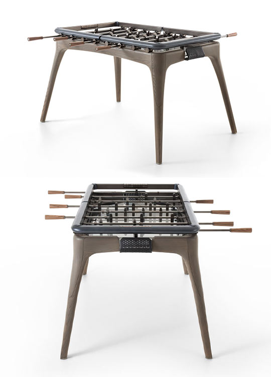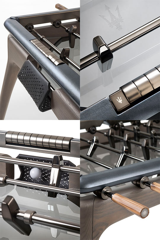 Every detail is thoughtfully considered. Its modern silhouette plays with solids and voids, creating a sense of motion while maintaining structural balance. Solid ash, available in four finishes—natural, charcoal gray, cookie, and ash gray—features opposing grain directions that amplify the impression of movement. The smoked glass playing field sits within a raised leather frame, with tone-on-tone corner inserts that guide the ball with subtle precision. Canaletto walnut knobs, echoing Maserati’s goblet-inspired forms, enhance ergonomics and fluidity.