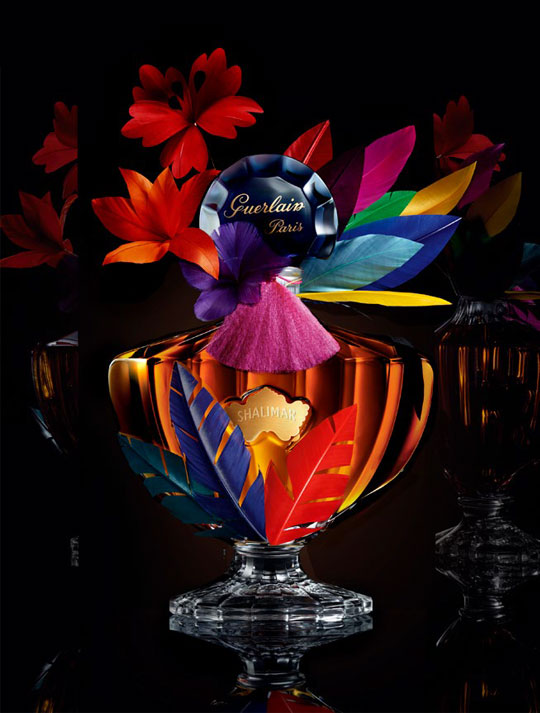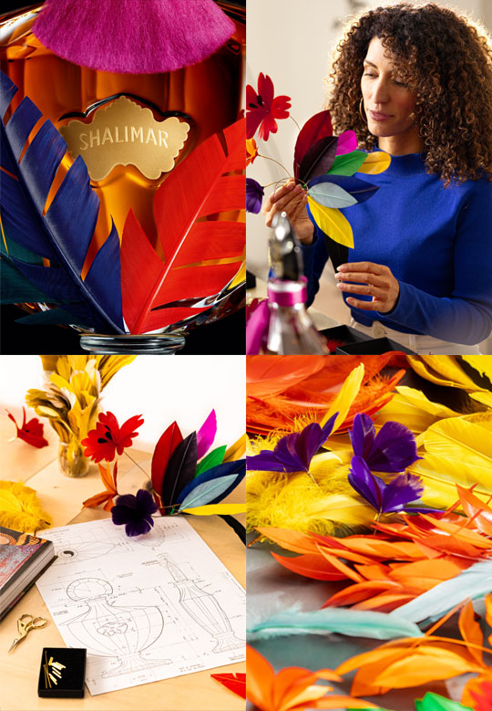 Feathers, silk, and radiant hues come together in a dazzling tribute to the lush gardens of Shalimar and the flamboyant spirit of Frida Kahlo, an admirer of the scent. Every feather is meticulously placed by hand, transforming the iconic bottle into a couture objet d’art — a tangible expression of emotion, craftsmanship, and beauty.