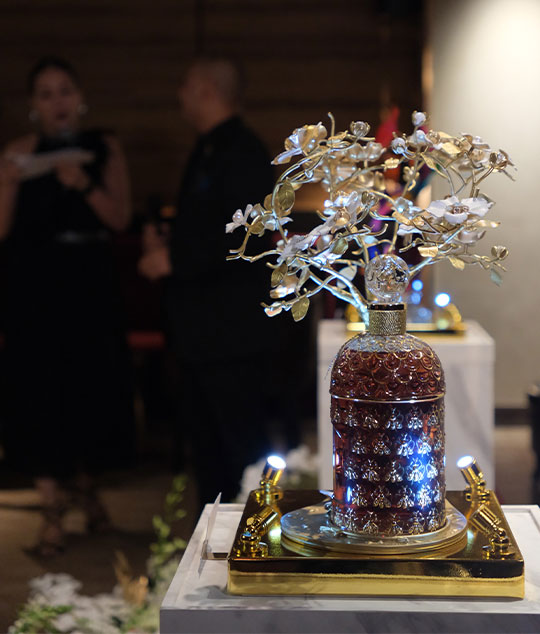 For the second masterpiece, Guerlain revives its legendary Bee Bottle through the hands of master jeweller Philippe Ferrandis. Wrapped in an exquisite apple tree sculpture, plated in 24-karat gold and adorned with 28 hand-enamelled blossoms, the bottle becomes a poetic symbol of love, protection, and abundance.