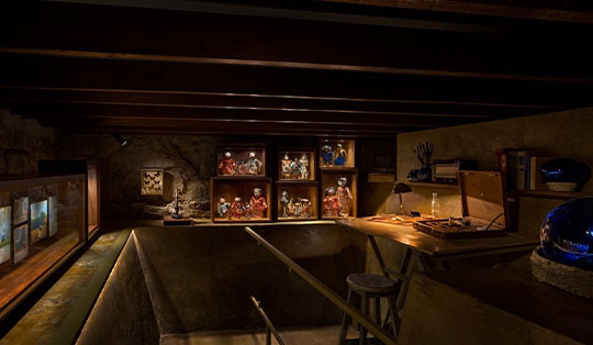 Wander through restored galleries and family rooms, then descend into her candlelit sanctuary — a room of quiet reflection where Frida painted, wrote, and collected the small wonders that fascinated her. Dolls, artworks, letters, and even her bug collection create a living mosaic of memory. Inspired by her sketches and love for the natural world, Rockwell’s LAB crafted an interactive microscope replica, letting visitors peer into the miniature universe that once captivated her imagination.