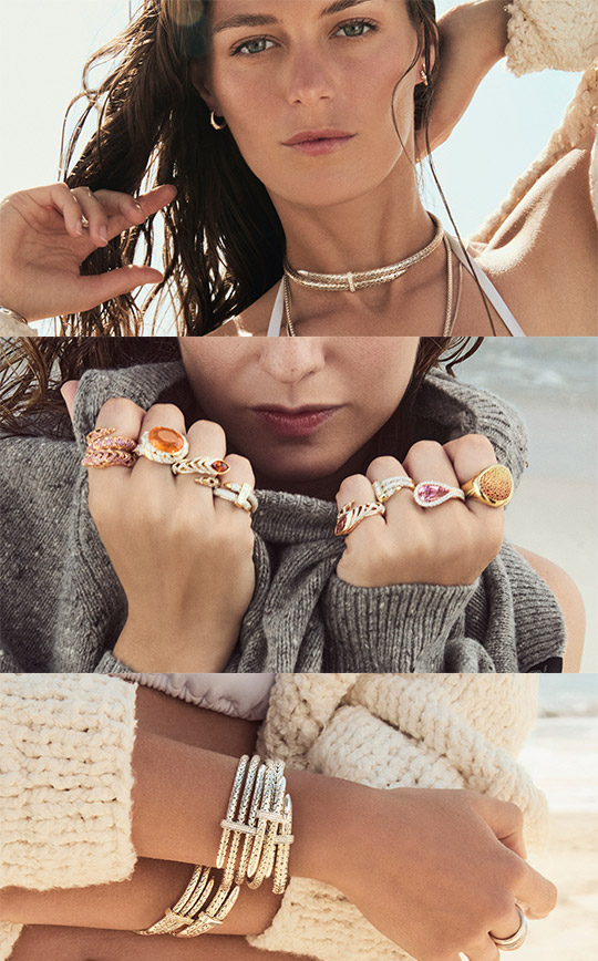 A wearable lightshow with vintage John Hardy appeal, rendered across coiled flex cuffs, hoops, chokers and rings. Price range: $475 – $5,900.