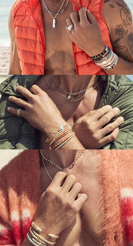 Heishi beads, hand-cut from spiny oyster shell, bring a jolt of natural color to summer stacking. Each stone is treated—or left raw—to highlight its unique character. Flecks, quirks and all.  Price range: $750 – $2,400