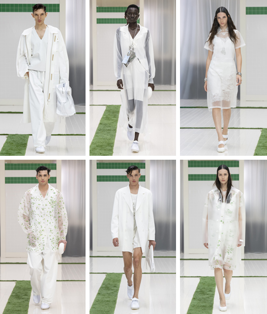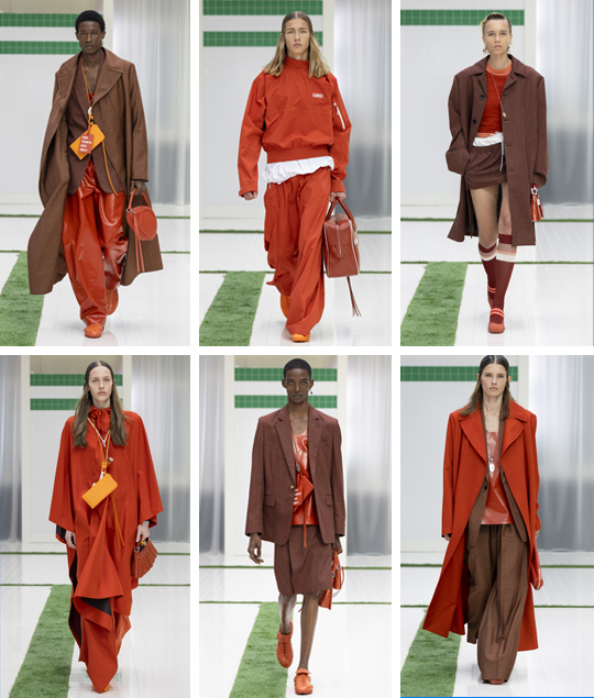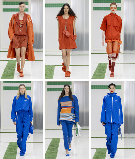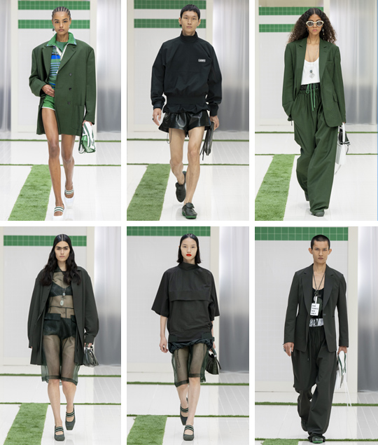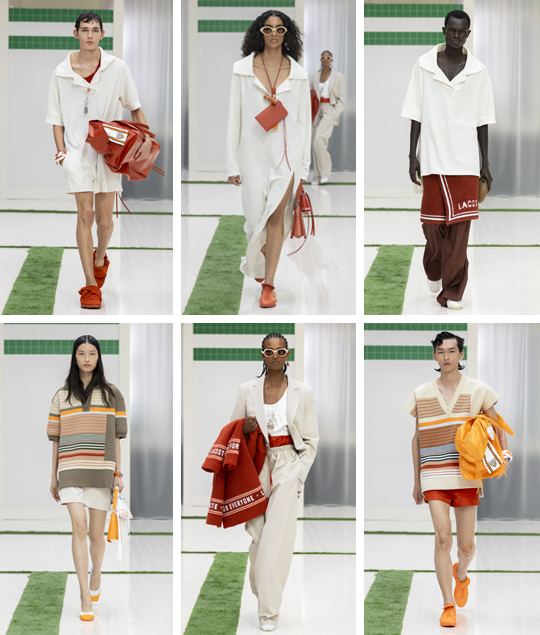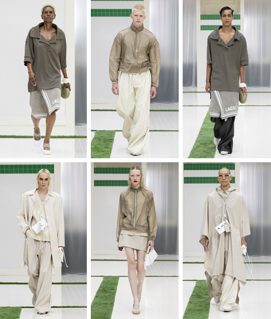 Oversized transparent polos, trench coat dan reflective leather dengan slogan “Tennis for Everyone”, tech-silk nylon ringan berpadu dengan katun karet utilitarian, hingga nylon berkilau seperti kain basah—semuanya menghadirkan dialog antara kekuatan atletik dan pesona sensual. Organza lembut menyerupai tirai mandi dan shimmering towel fabrics muncul dalam cara tak terduga, menambahkan sentuhan playful yang menyenangkan mata. Tailoring longgar yang sensual melanjutkan eksperimen musim lalu, sementara polo klasik Lacoste hadir dalam poplin dan terry fabrics, dihiasi tulisan “Tennis for Everyone” dan “Only for Tennis”. Heritage bertemu modernity di setiap siluet.