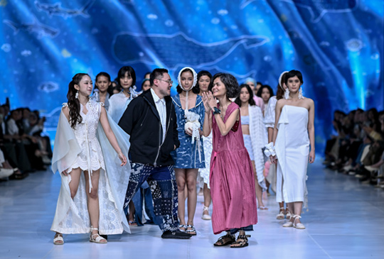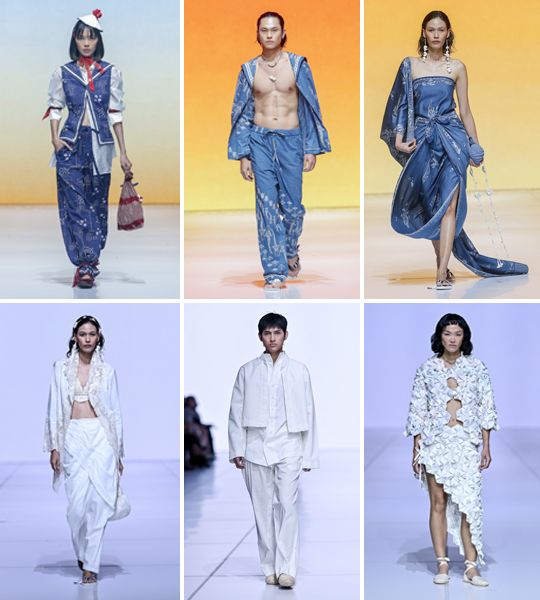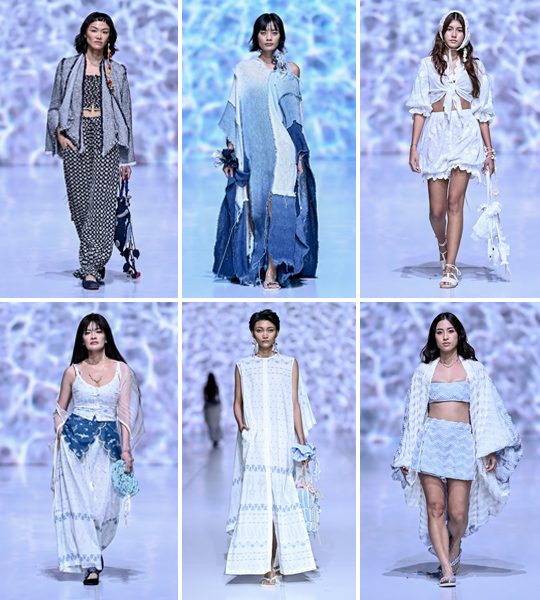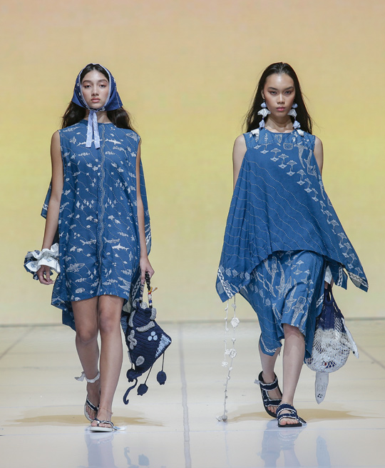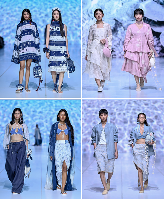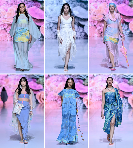 Koleksi ini terdiri dari 30 tampilan busana yang mengalun lembut dalam palet biru dan putih—warna laut yang menenangkan, sekaligus pengingat akan karang yang memutih. Siluet kebaya, rok lilit, outerwear, hingga kain batik tulis berpadu dengan motif biota laut seperti pari, paus, dan penyu, bersanding harmonis dengan motif klasik Sejauh seperti Ombak Laut, Bunga Laut, dan Tambal. Setiap helai terasa seperti serpihan doa—tentang laut yang bernafas, tentang ingatan, tentang waktu yang kembali mengalir.