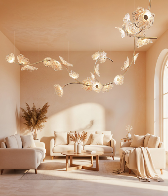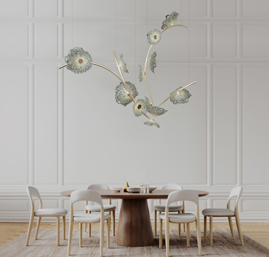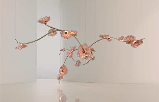 At its core is Rosa, a new concept by designer Martin Gallo, born from experimental glassmaking that rejects the expected. Rosa’s fluid forms can scale from a single, jewel-like pendant to a full spatial choreography of glowing blooms. Its silhouette feels instinctive — growth made visible, hope made structural.