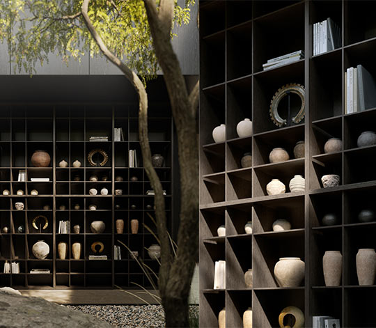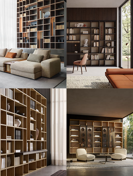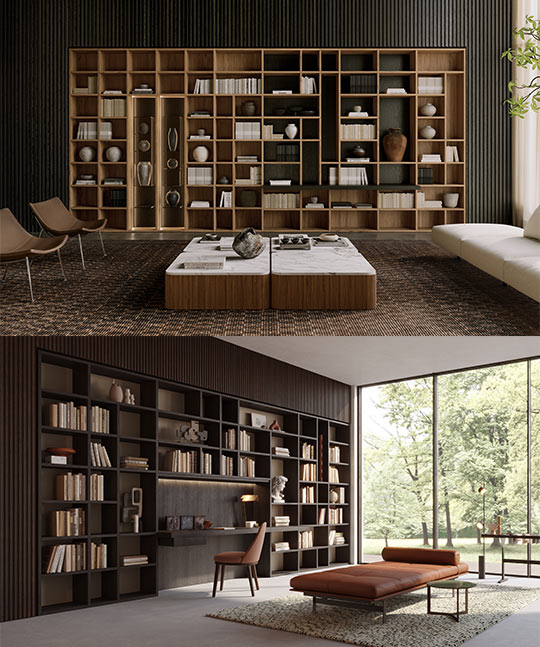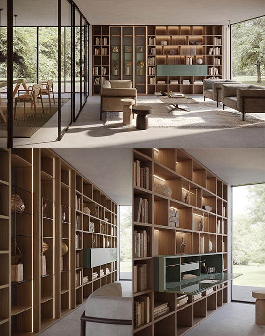 Selecta adapts effortlessly to home offices and study areas. Bookshelves, archives, and desk supports keep essentials orderly while leaving room for personal touches. Velvet-backed compartments and glass shelves turn storage into display, highlighting collections and cherished objects. Its modularity accommodates double heights and sloped cuts, proving that functional spaces can be both beautiful and alive.