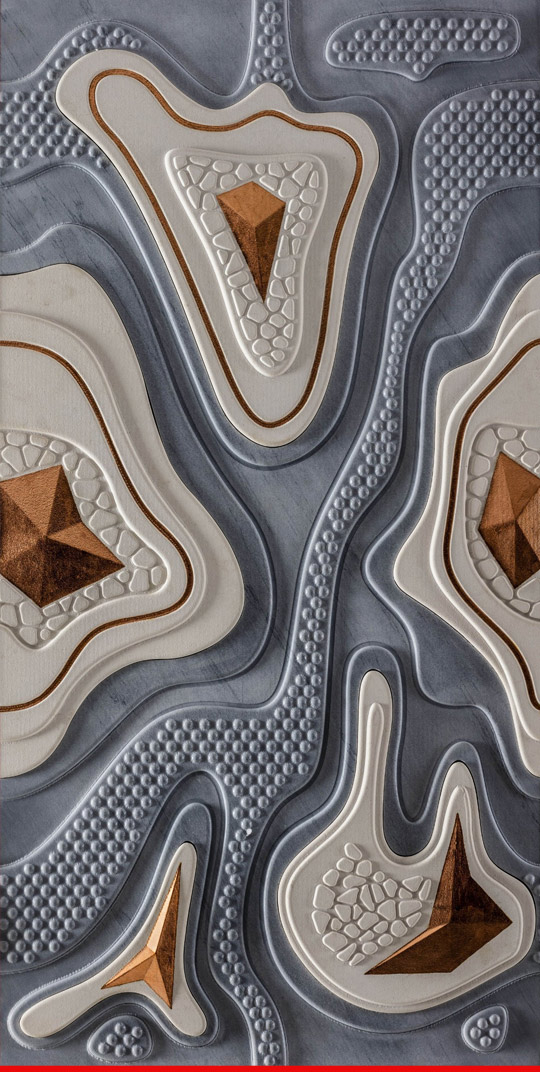Crafted from Bardiglio Imperiale marble with Bianco Fenice inlays and finished with hand-applied copper leaf inserts, the 60 × 120 × 4 cm panel balances material richness with sculptural depth—transforming a volcanic spectacle into a refined architectural statement.