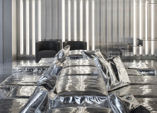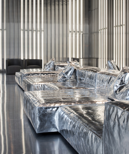 The suspended form of Lemni takes on the glow of the season in ruby leather—an unexpected, refined accent that blends minimalism with celebratory richness. Meanwhile, the iconic Extrasoft modular sofa shimmers in silver reflective fabric, capturing and scattering light with theatrical brilliance. A luminous centerpiece, it transforms living spaces into stages for celebration.