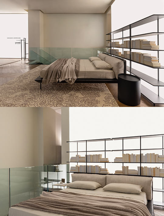 The night setting shifts the tone toward softness and introspection. A preview of 2026 is revealed through the Greene Bed by David Lopez Quincoces, whose gentle curves convey an ease that feels instinctive rather than designed. Confident armchairs extend the space beyond rest into conversation, framed by the light architectural rhythm of Aero bookcases.