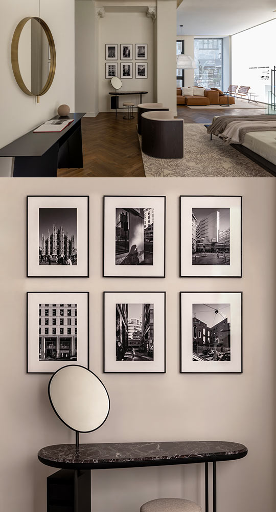 A scenographic vignette forms around the Inari console, flanked by Kigi coat hangers and crowned by the Galileo mirror — a study in verticality and reflection. Nearby, the Pebble vanity creates a moment of retreat, accompanied by photographs from Soliloqui: Milano by Gianluca Vassallo. The presence of Milan is subtle yet tangible — not as backdrop, but as cultural undercurrent.