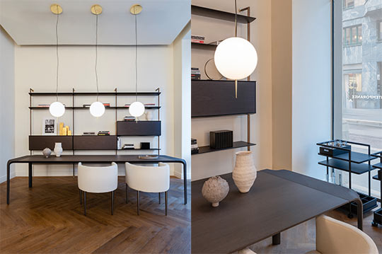 From there, the living area composes itself through balance and proportion. The Brasilia table beneath Ad-astra pendants establishes a vertical dialogue of light and structure, while the sculptural Ouzo easy chairs introduce a subtle counterpoint. Sailor bookcases trace graphic lines along the wall; the Alvea sideboard, paired with the Paradigma mirror and charcoal-dyed oak accents, deepens the material palette without excess. Even the Aero T trolleys, visible from the windows, function as quiet punctuation marks — mobile, precise, restrained.