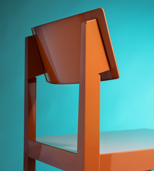 Crafted from a 1 mm steel sheet, each Bishop is laser-cut, bent, and welded into a solid yet refined structure, available in a variety of colors. The design is simple, almost archetypal: four legs, a seat, and a back — each detail meticulously considered. Its glossy finish reflects light, highlighting clean geometry and giving Bishop a subtle aura of luminosity.