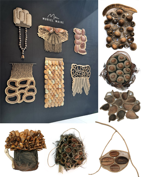 Two artisans from Ateliers d’Art de France, Muriel Maire and Ana Montaya, embody this spirit. Maire, based in Brittany, creates poetic masks from plant fibers, driftwood, and dried flowers; while Montaya, in Marseille, assembles delicate collages of pods, eggshells, and silk cocoons. Both transform nature’s raw elements into tactile, dreamlike works that invite reflection and touch.