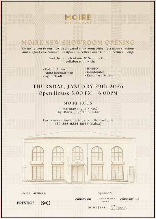 Coming soon, Moire Bespoke Rugs will unveil its new Jakarta showroom—an important milestone for Indonesia’s bespoke design landscape, presented in parallel with the 12th anniversary of PT Hesitada Inti Design and the launch of Floor Fairy Tales Vol. 4.