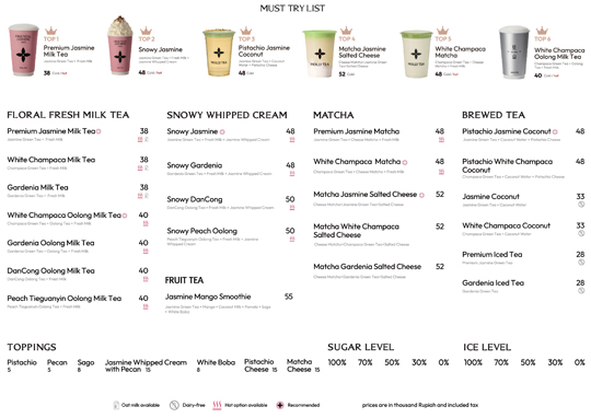 Seluruh varian Milk Tea tersedia dalam pilihan susu segar dan susu oat untuk varian tertentu, seperti Jasmine, Gardenia, dan White Champaca Oat Milk Tea. Untuk memperkaya pengalaman menikmati floral tea yang lebih personal, Anda dapat menambahkan topping premium, seperti topping kacang-kacangan Pecan dan Pistachio, White Boba dan Sago. Serta mousse dan krim seperti Jasmine Whipped Cream with Pecan, Pistachio Cheese, dan Matcha Cheese, menghadirkan pengalaman minum teh yang dijamin memanjakan.