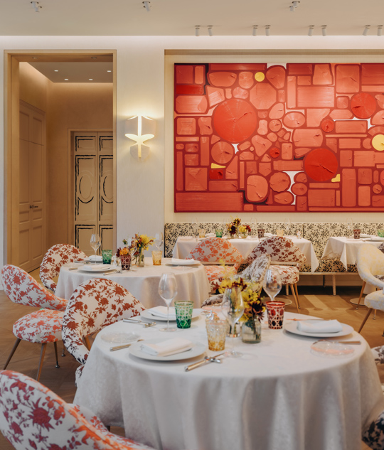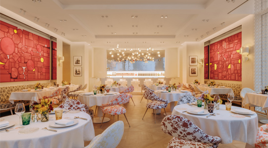 The setting reinforces this sensorial dialogue. Bathed in light and softened by pale hues, the dining room is accented with carefully curated artworks and floral-patterned armchairs that echo Dior’s refined femininity. The atmosphere is luminous yet intimate, offering a graceful backdrop where the arts of fashion and cuisine meet.