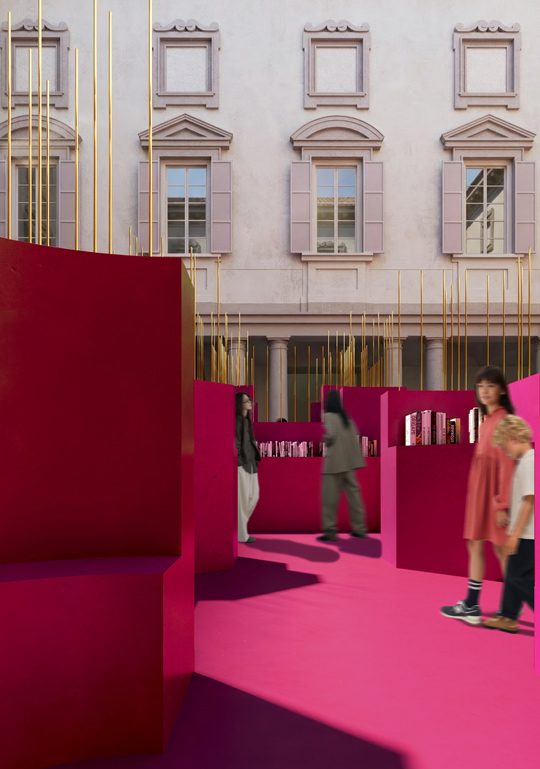 Set against the Baroque symmetry and axial clarity of Palazzo Litta, Ghotmeh introduces curved geometries, shifting perspectives, and a sequential path that subtly disrupts monumentality. The pavilion unfolds as a labyrinthine environment in which the visitor’s body becomes part of the spatial composition.