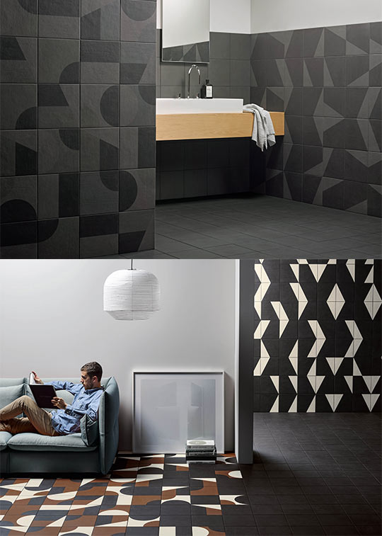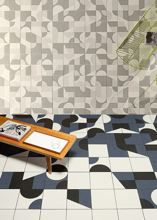 Conceived as a modular system, the collection moves away from the idea of a single decorative tile and instead proposes a language of geometry and colour. Graphic motifs converse with solid tones, allowing walls and floors to shift in rhythm — at times bold and expressive, at others restrained and architectural.