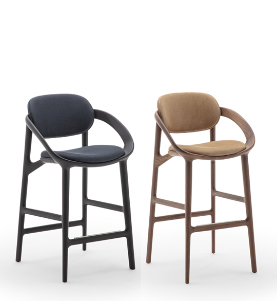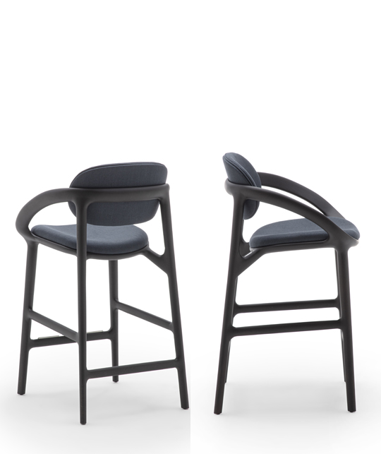 The distinctive lines of the Molly chair evolve into Molly Stool, a new interpretation that refines the original design with a lighter and more elongated silhouette. By carefully rebalancing the chair’s defining elements, the designers have created a slimmer structure that enhances the visual lightness of both the seat and the backrest.