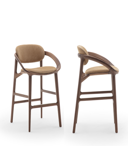 Crafted from solid wood, the frame traces harmonious, enveloping lines and incorporates integrated armrests that reinforce both comfort and the continuity of the design. Upholstery options from the collection’s fabrics enhance the softness of the seat and backrest, creating a refined dialogue between textile textures and the warm expressiveness of wood.